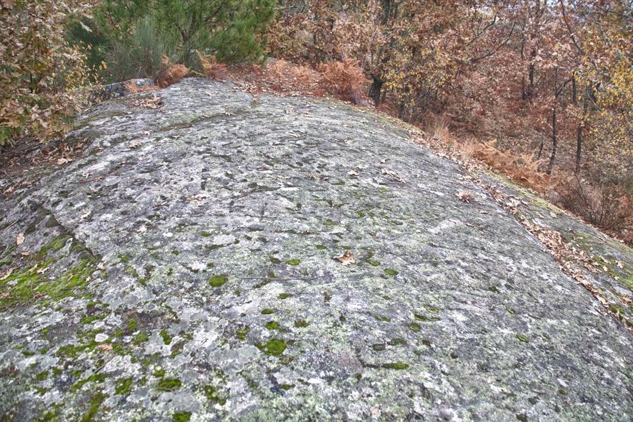 Sítio pré-histórico. Arte rupestre ao ar livre. Gravuras dispostas segundo diversas orientações e representando símbolos cruciformes, em fi, arco ultrapassado, fossetes e em forma de machado.